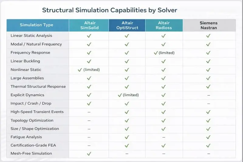 At a high level, these solvers aren’t trying to do the exact same job. They’re designed to work at different speeds, depths, and moments in the engineering process. Tools like SimSolid make it easy to get quick structural insight early. OptiStruct takes things further by helping teams optimize performance and weight while providing accurate simulation results. Radioss handles tough impact and crash-style events, and Nastran provides the trusted backbone for detailed, signoff-level structural analysis.