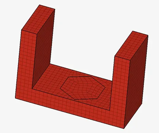 After the command executes, the hexagon surface is now imprinted on the bracket, so if we view just a geometry view or element view, we will see the boundaries of the hexagon surface on the red bracket (Figure 5). Since I am only worried about running a simulation on the red bracket and just need the hexagon surface as a location to apply the load, I can now run the model. Just like that, I was able to get the proper surface imprinted, and ready for simulation. No need to jump back to my CAD tool!