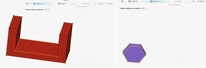 Figure 4: Left, Specifying Target Surface of Red Bracket and Right, Selecting Imprint Surface of Hexagon