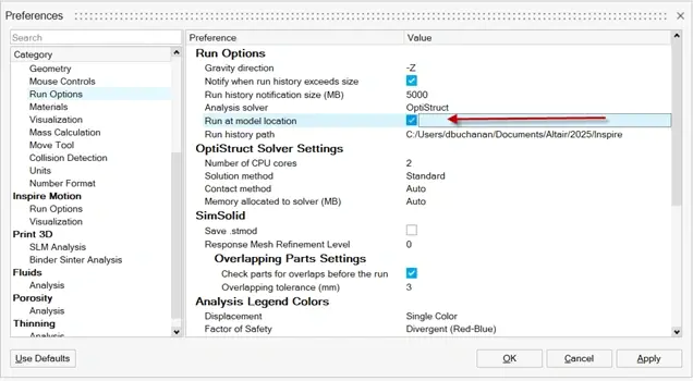 In order to access the run folder, you can do it in a few different ways. First we need to access where the run folder location is stored at. To find where the run folder is located go to File>Preferences > Run Options in Inspire. The default run folder path is located under the Run History path, this folder location can be changed if desired. However, one of the options I like to turn on, is the “run at model location” checkbox. When this option is checked, the run folder will be automatically saved wherever you save your Inspire File (Figure 3), rather than the Run history path. This makes it a lot easier to save all the run folders that a user may need!