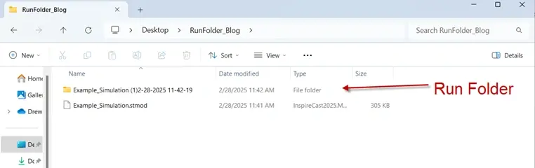 To access the fun folder, we need to start a simulation and once the simulation completes, we can access the run folder via the file location we saved it at. If we checked the checkbox: “run at model location”, the run folder will be saved in the location where we saved our Inspire file. So, let’s navigate to the folder where our Inspire file (Inspire files have the file extension .STMOD) is saved. When I navigate to this location, I notice a separate run folder above the inspire .STMOD file (Figure 4), this is the Run Folder.