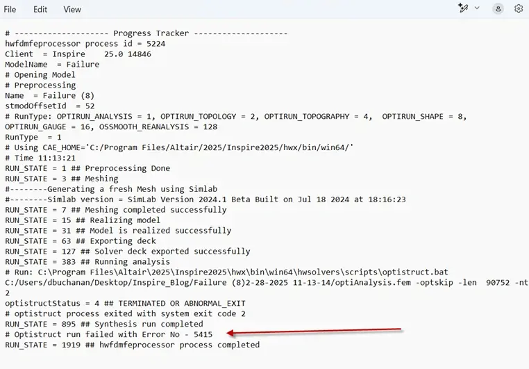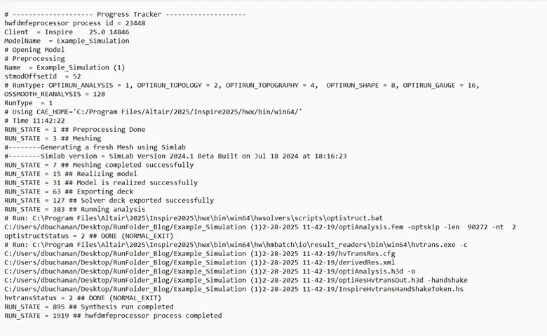 We can see in Figure 6, that the progress text file will show users every stage that happens during an Inspire simulation. For this file, we can see an error occurs during solving, and it tells the user its an OptiStruct Error 5415. Note OptiStruct errors are searchable in the OptiStruct help guide. If I search for this error, I can see that it’s an abnormal exit error, which could be due to a variety of things. However, my guess is something on my operating system force closed Inspire without me wanting it to happen. Thus, I know its not a mesh failure or a specific singularity error, so in this case, I just need to rerun the model and that should resolve the issue. When I do rerun the model, I get a successful run, and I can see it in my new updated progress file (Figure 7), as the last line of the progress file says file successfully completed.