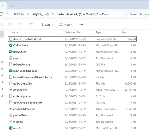 So, let’s first discuss what the Inspire run folder is. In inspire, when you run a simulation, it will automatically create a mesh for you and then start solving the analysis. However, as its going through these operations, it is actually generating a number of files in the background. These files are all unique and will pertain to the type of solver you are using in Inspire (Inspire currently supports OptiStruct and SimSolid as solvers). Some examples of these types of could be the solver input deck, the output file, parameter files, or mesh files, among many others.