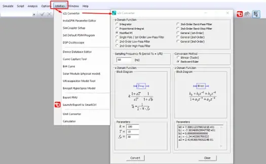 PSIM has a tool built directly into its interface that allows users to convert freely from the s-domain to z-domain. Simply navigate to the utilities tab, choose s2z Converter, and enter the parameters for the s-domain transfer function. The dialog box, shown in Figure 2 below, displays the expected input parameters (based on the selected s-domain function type), sampling frequency, and conversion method selections. Users can enter all necessary values, using the block diagram representations as ‘blueprints’ for each function, and compute the outputs.
