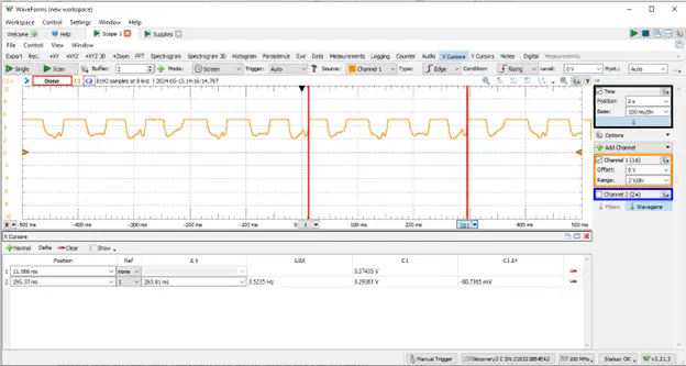 However, we can see that not all ‘high’ values (reflective areas) are the same, which is likely due to inconsistencies in the size of the reflective and non-reflective portions of the encoder wheel. In this project, the wheel was created by hand, so some inconsistencies are not completely unexpected, but it is something an engineer would need to address before moving to full-scale production. To account for this inconsistency in the measurement, we can look at the time and frequency over an entire rotation of the wheel, which is equivalent to 4 cycles of reflective to non-reflective sections. Figure 6 below shows that the approximate frequency is 3.5 Hz, which is very close to our 14.4 Hz when multiplied by 4 to find the frequency of an individual cycle.