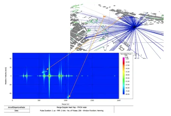 Last, but certainly not least, WinProp now supports Pulse Radar, which allows users to simulate brief repeated radio-frequency pulses to locate and track moving targets. With this new tool, the simulations allow for rectangular, frequency-modulated, and phase-modulated pulses, meaning you can identify the best for your potential application. With its matched filtering and improved signal-to-noise ratio (SNR), the new Pulse Radar capability detects objects with high levels of sensitivity and accuracy. As Figure 5 below shows, this feature generates a Range-Doppler heat map, which can then be used to find the location and velocity of the target.