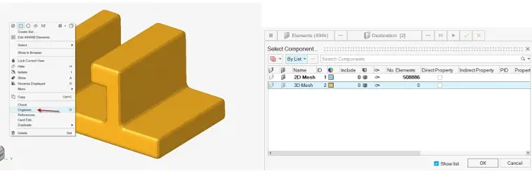 After isolating just the 3D elements, I can highlight all the elements in the main graphical window, and then right mouse button click and select Organize (Figure 5). The Organize command will pop up, and it will show the selected elements, which are the 3D elements I isolated. I can then move them to the designated location which in this case will be the 3D mesh component collector (Figure 5). Once I hit ok it will complete the command.
