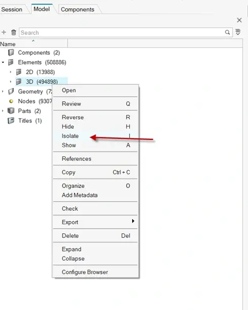 One of the great things about HyperMesh 2025 and the new interface is there is a command called Organize, which allows users to easily copy mesh and other geometry information into different collectors (load, components, etc). I will use this Organize command to copy the 3D elements into the 3D Mesh component collector. To do this, I go to the model browser in HyperMesh, and I right mouse button click on the 3D elements and select Isolate so only the 3D elements are showing in the main graphical window (Figure 4).