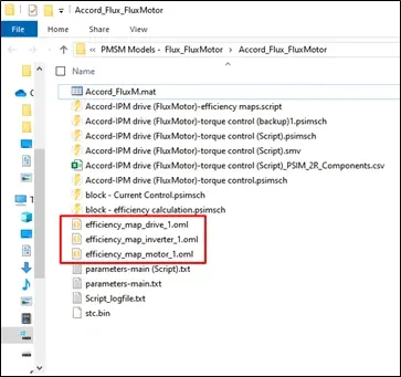 Schematic files are not the only automatically generated outputs of this script, though. In fact, the main exports are the OML (Open Matrix Language) files that are coded and saved without needing user input. These programs can then be opened and executed in any OML compiler, such as Altair Compose, which almost all Altair PSIM users will already have access to! Figure 4 below highlights the three main scripts: one for each efficiency contour of the motor, inverter, and motor drive.