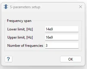 It will then give you a dialog menu to add your S-Parameters frequency span. For my example I am going to add 14GHz as my lower limit, and 16GHz as my upper limit and add 3 frequencies and select OK. This is basically saying add 3 frequencies at 14, 15 and 16GHz.
