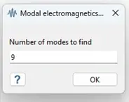 To set this study up, go back to the main ribbon and select the Electromagnetic symbol, then Modal electromagnetics. This will pop up a menu asking you to define the number of modes. For my example, I will add 9 modes.