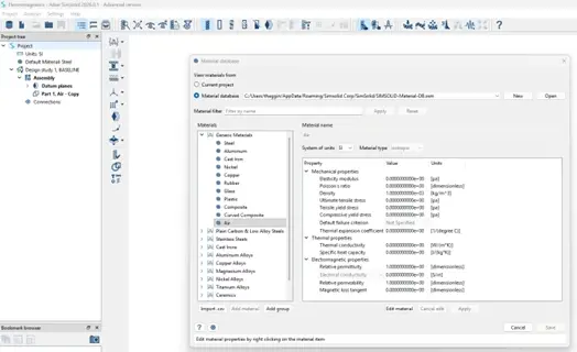 To start setting up an electromagnetic simulation in SimSolid, I am going to create a new material and label it “Air”. I do this to define the entire device as air first. I can later define faces regions as other materials, such as conductors, but it will keep the interior and open faces defined as air.