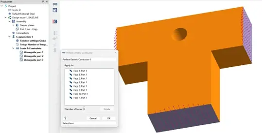 Then, the only parameters I need to define is the conductor, by selecting the Perfect Electric Conductor symbol. And for this example, I chose the entire model, so all the open faces.